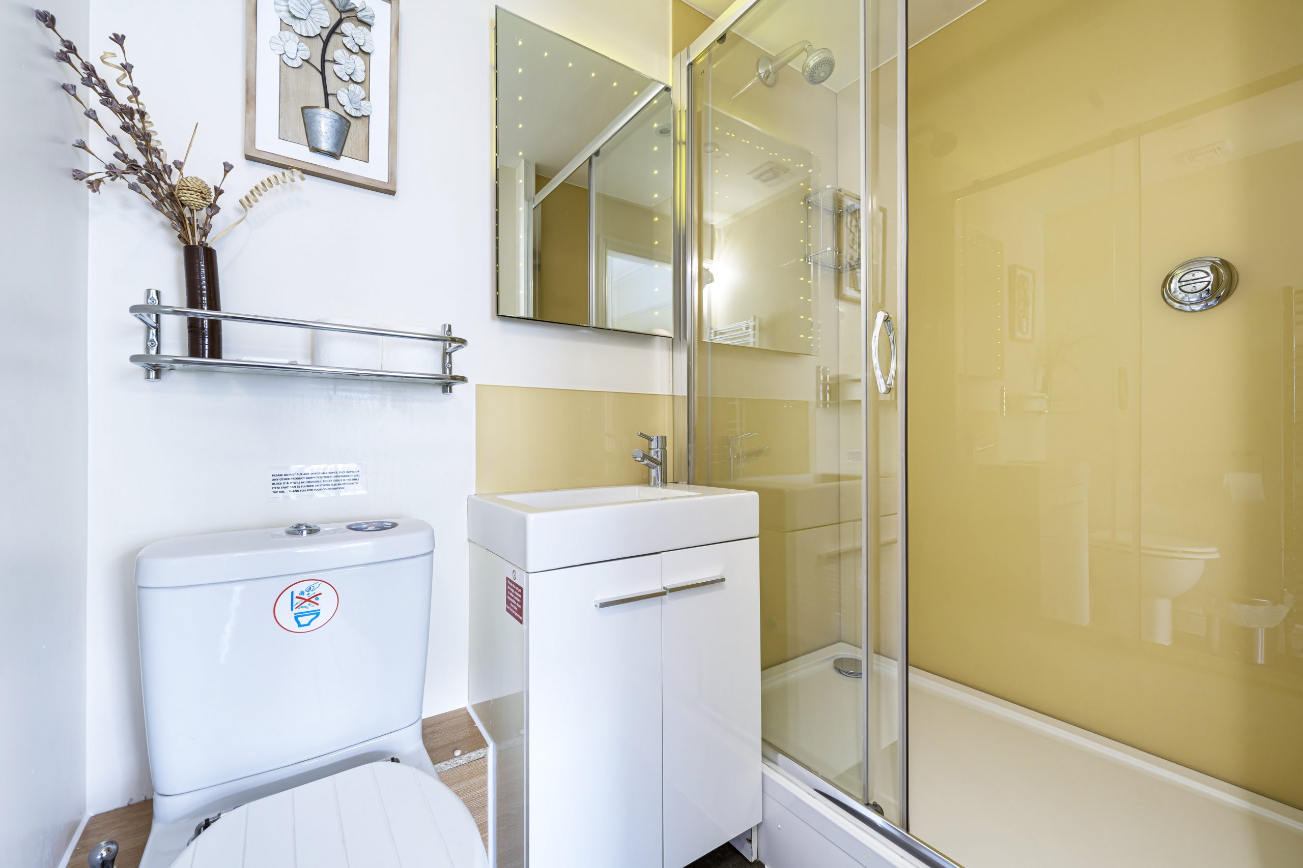 The en-suite bathroom is equipped with a large walk-in power shower, hand basin, mirror and lavatory.