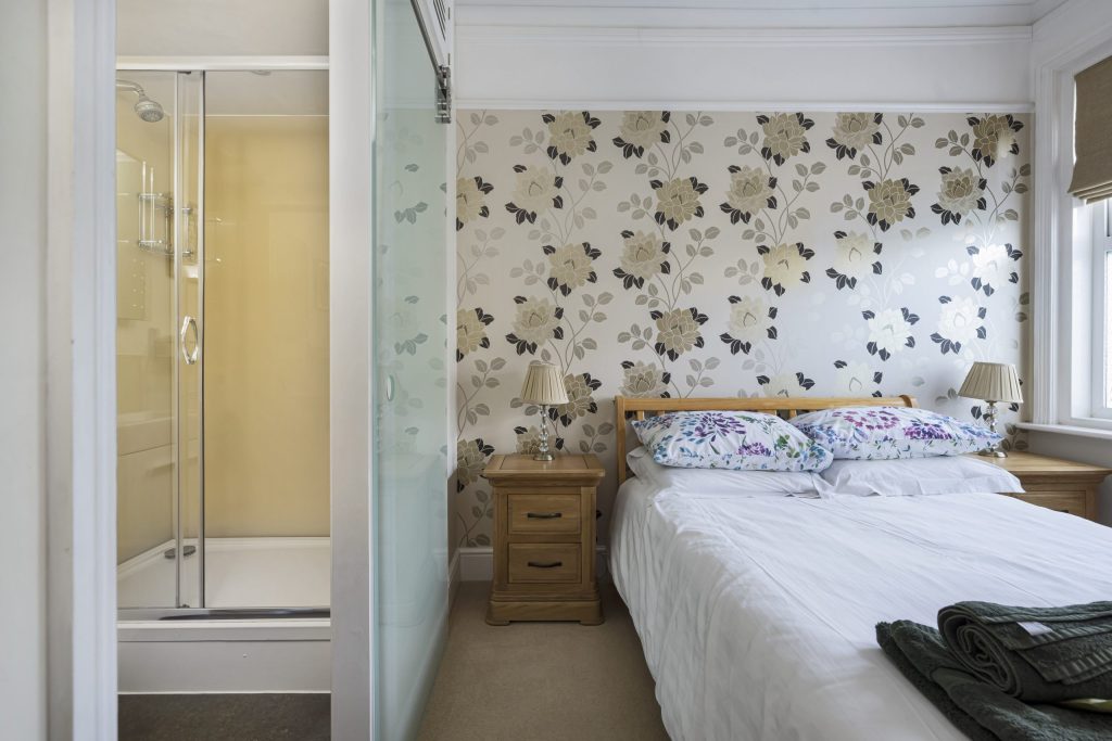 A lovely double en-suite room with a wallpaper feature wall and garden view.